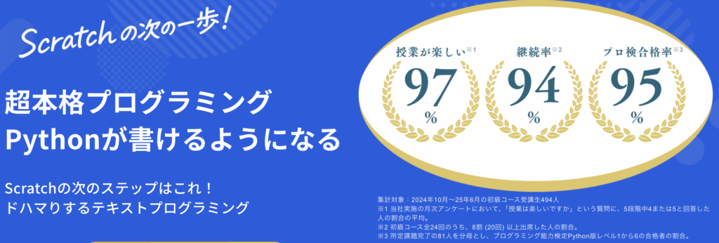 今後の中高のIT教育や将来のキャリアにも直結するPythonが、基礎から体系的に学べます。 - 初級コースの継続率が非常に高い(97%)